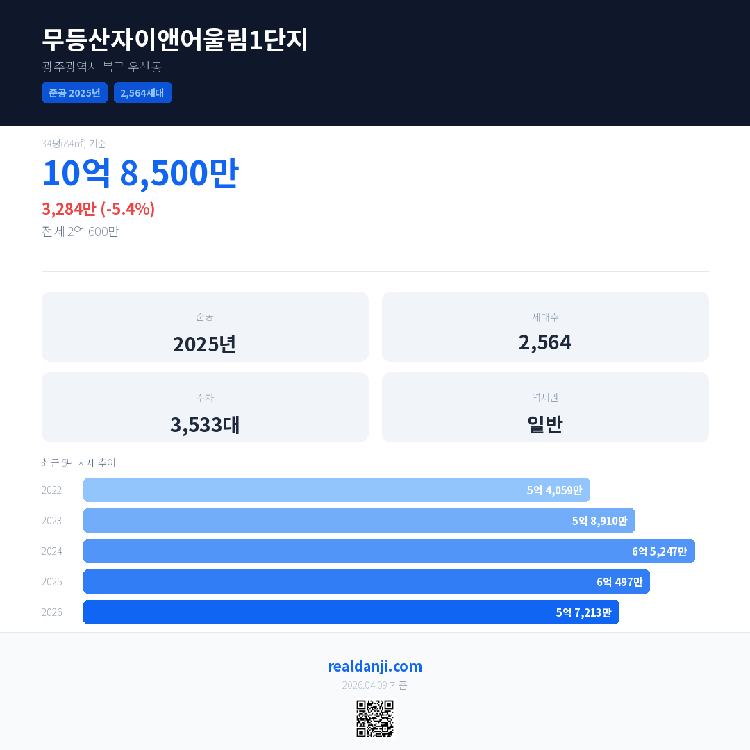 무등산자이앤어울림1단지은(는) 2025년에 준공되었으며, 현재 1년차입니다. 총 2,564세대 규모입니다.
