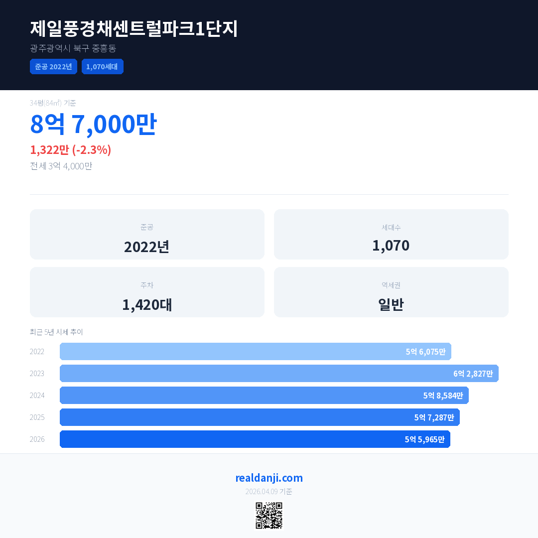 제일풍경채센트럴파크1단지 국민평형 기준 2026년 평균 거래가는 5억 5,965만으로, 전년 대비 2.3% 하락 했습니다.