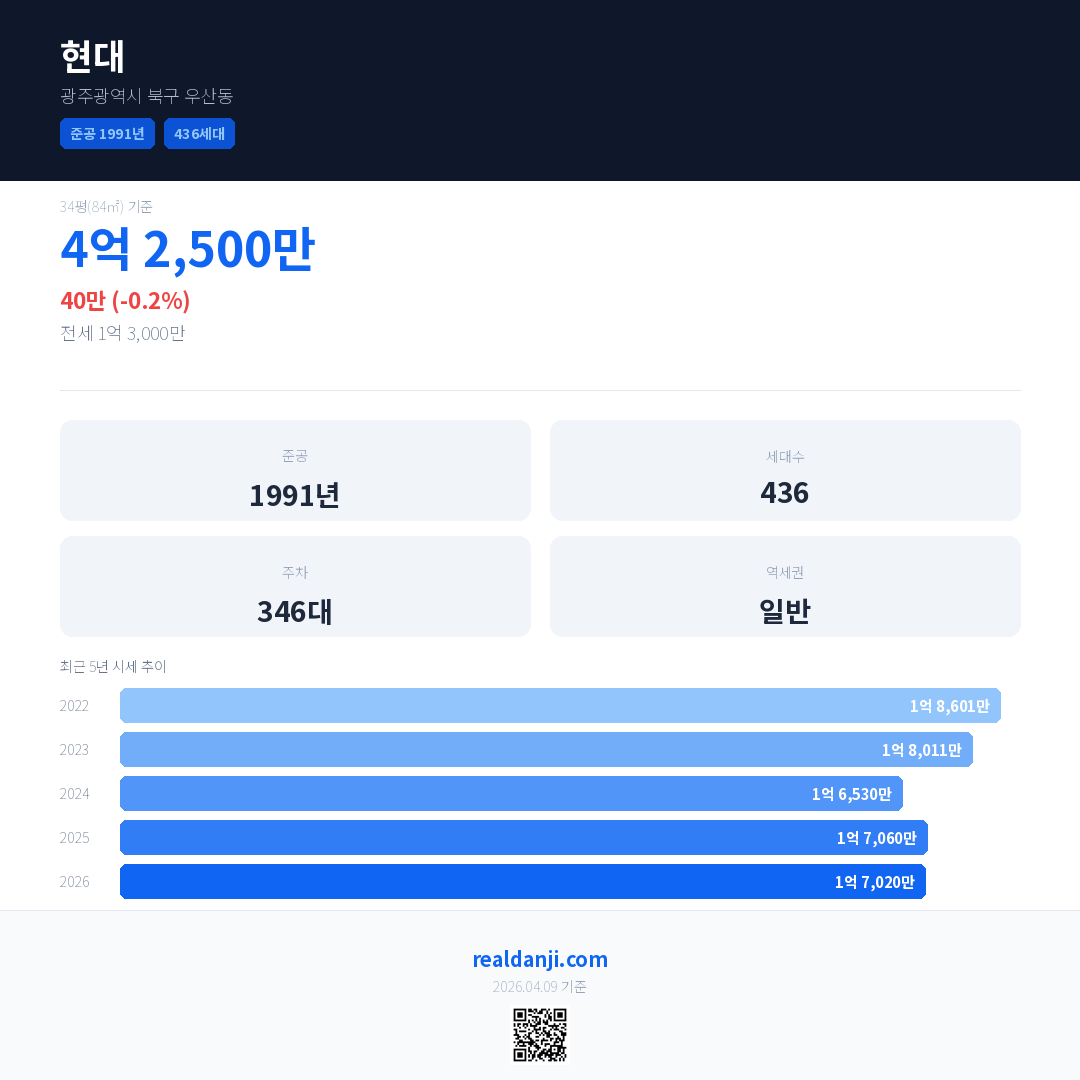 현대 국민평형 기준 2026년 평균 거래가는 1억 7,020만으로, 전년 대비 0.2% 하락 했습니다.