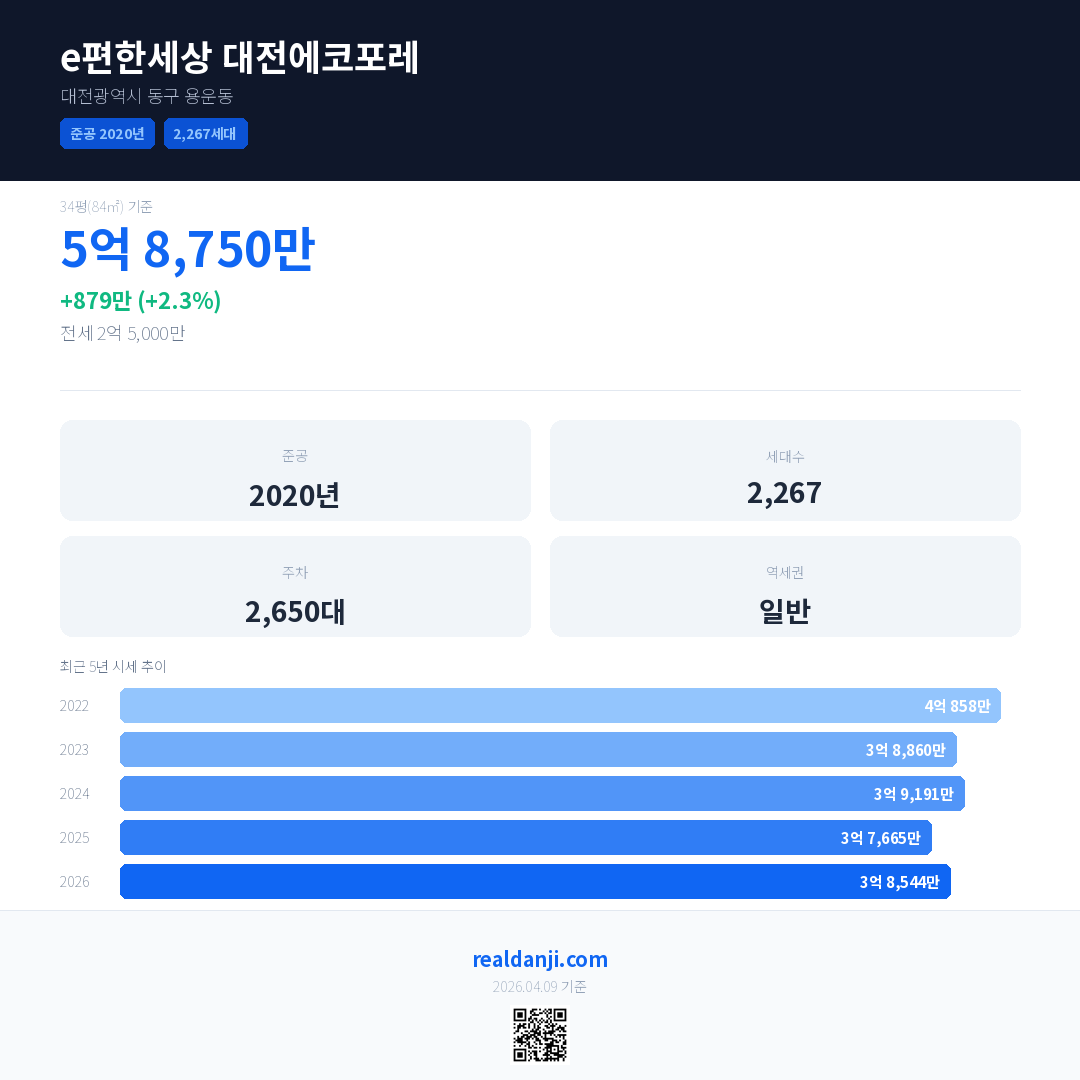 e편한세상 대전에코포레 국민평형 기준 2026년 평균 거래가는 3억 8,544만으로, 전년 대비 2.3% 상승 했습니다.