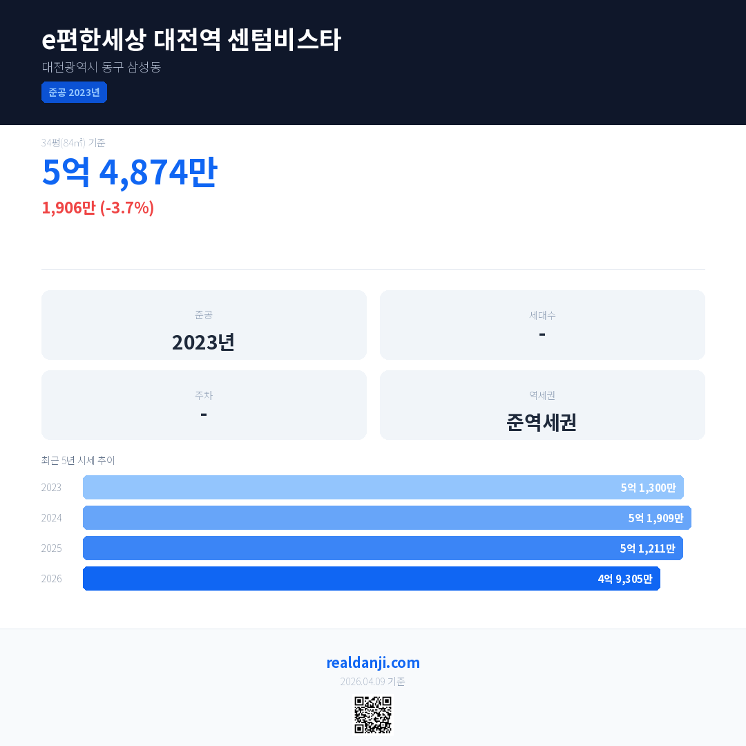 e편한세상 대전역 센텀비스타 국민평형 기준 2026년 평균 거래가는 4억 9,305만으로, 전년 대비 3.7% 하락 했습니다.