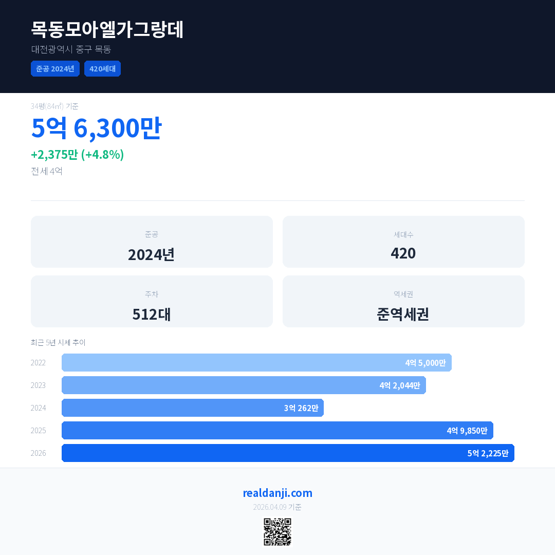 목동모아엘가그랑데 국민평형 기준 2026년 평균 거래가는 5억 2,225만으로, 전년 대비 4.8% 상승 했습니다.