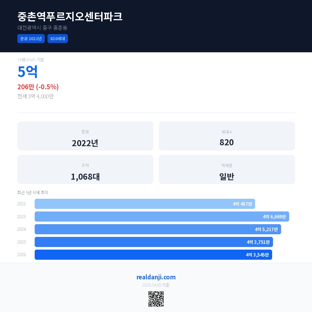중촌역푸르지오센터파크 최근 거래가는 4억 1,000만입니다. (2026-04)