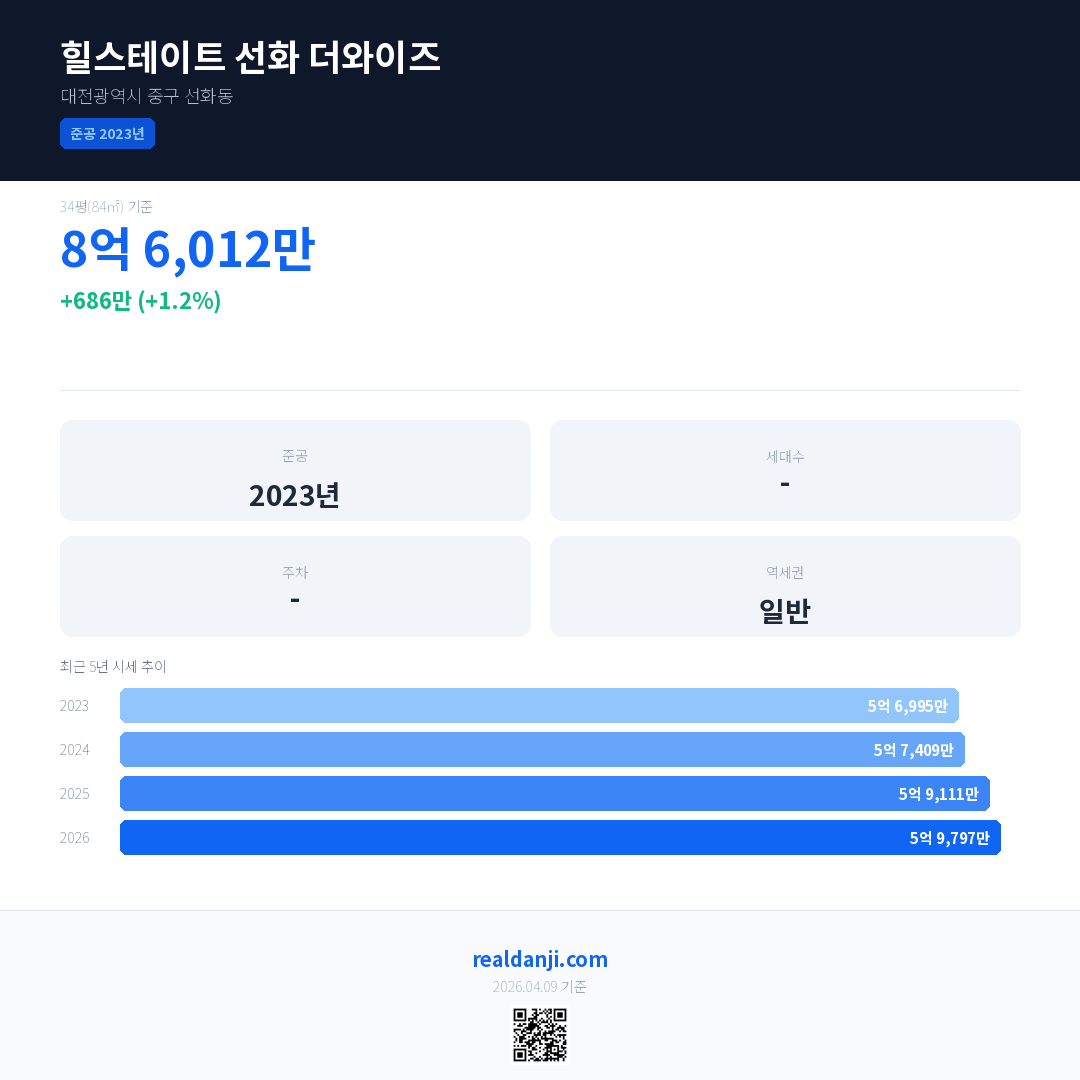 힐스테이트 선화 더와이즈 국민평형 기준 2026년 평균 거래가는 5억 9,797만으로, 전년 대비 1.2% 상승 했습니다.