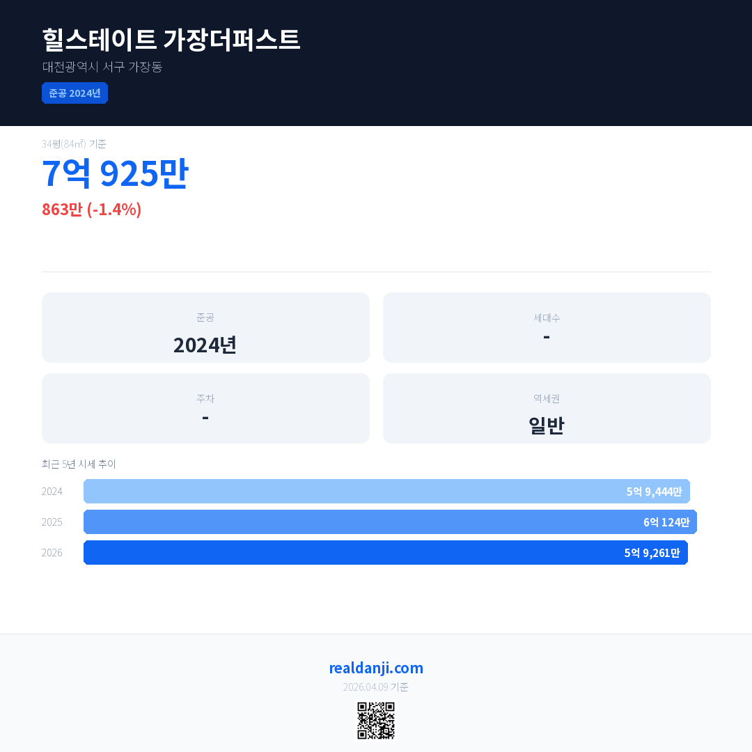 힐스테이트 가장더퍼스트 국민평형 기준 2026년 평균 거래가는 5억 9,261만으로, 전년 대비 1.4% 하락 했습니다.