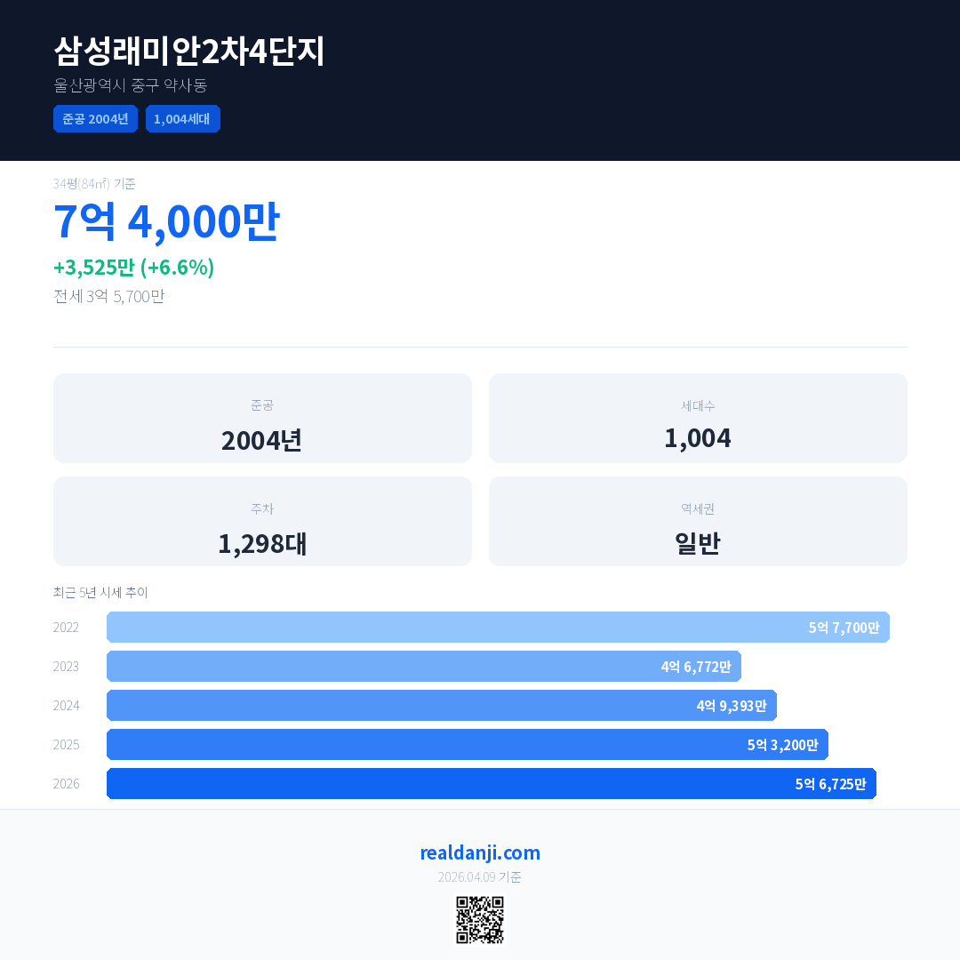 삼성래미안2차4단지은(는) 2004년에 준공되었으며, 현재 22년차입니다. 총 1,004세대 규모입니다.