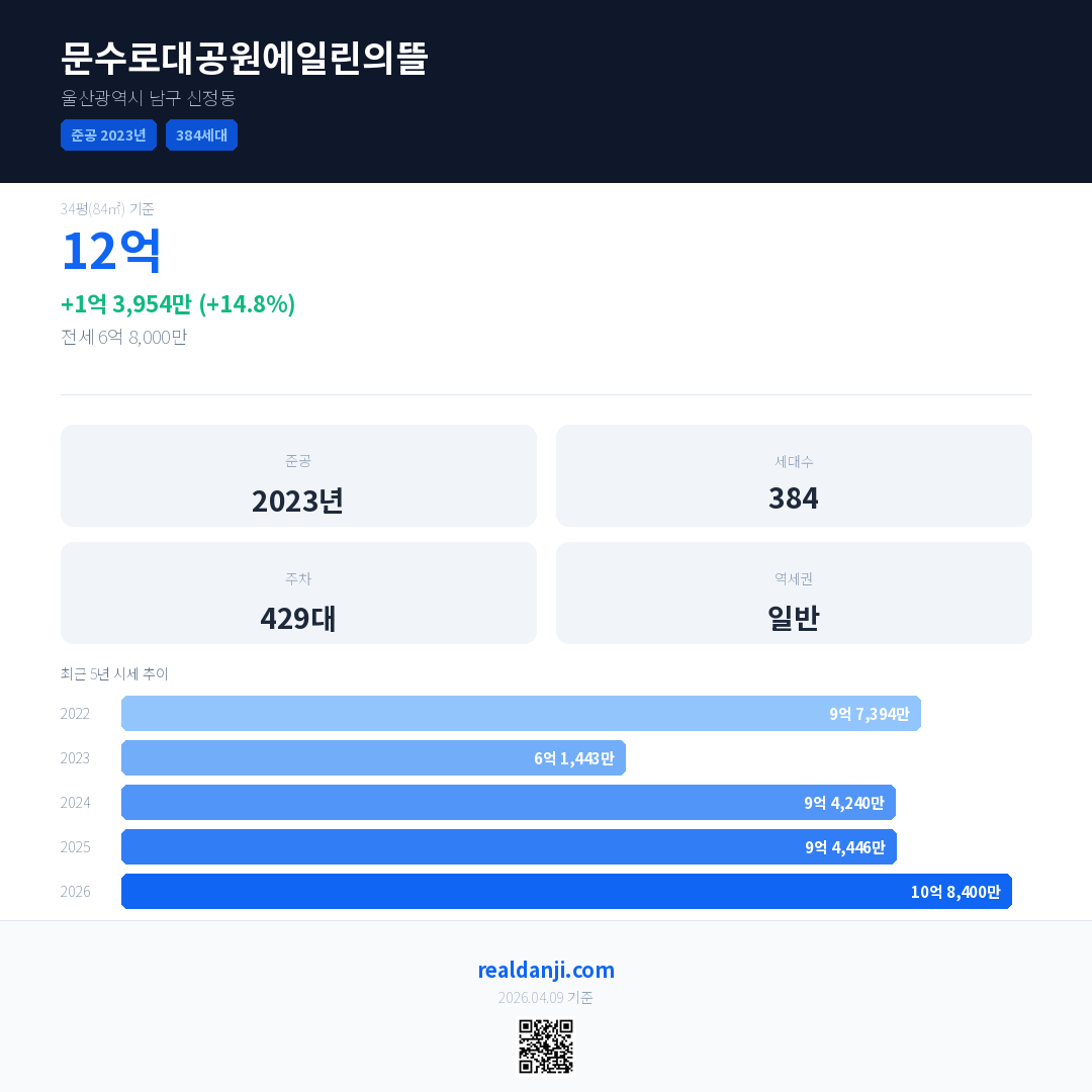 문수로대공원에일린의뜰은(는) 2023년에 준공되었으며, 현재 3년차입니다. 총 384세대 규모입니다.