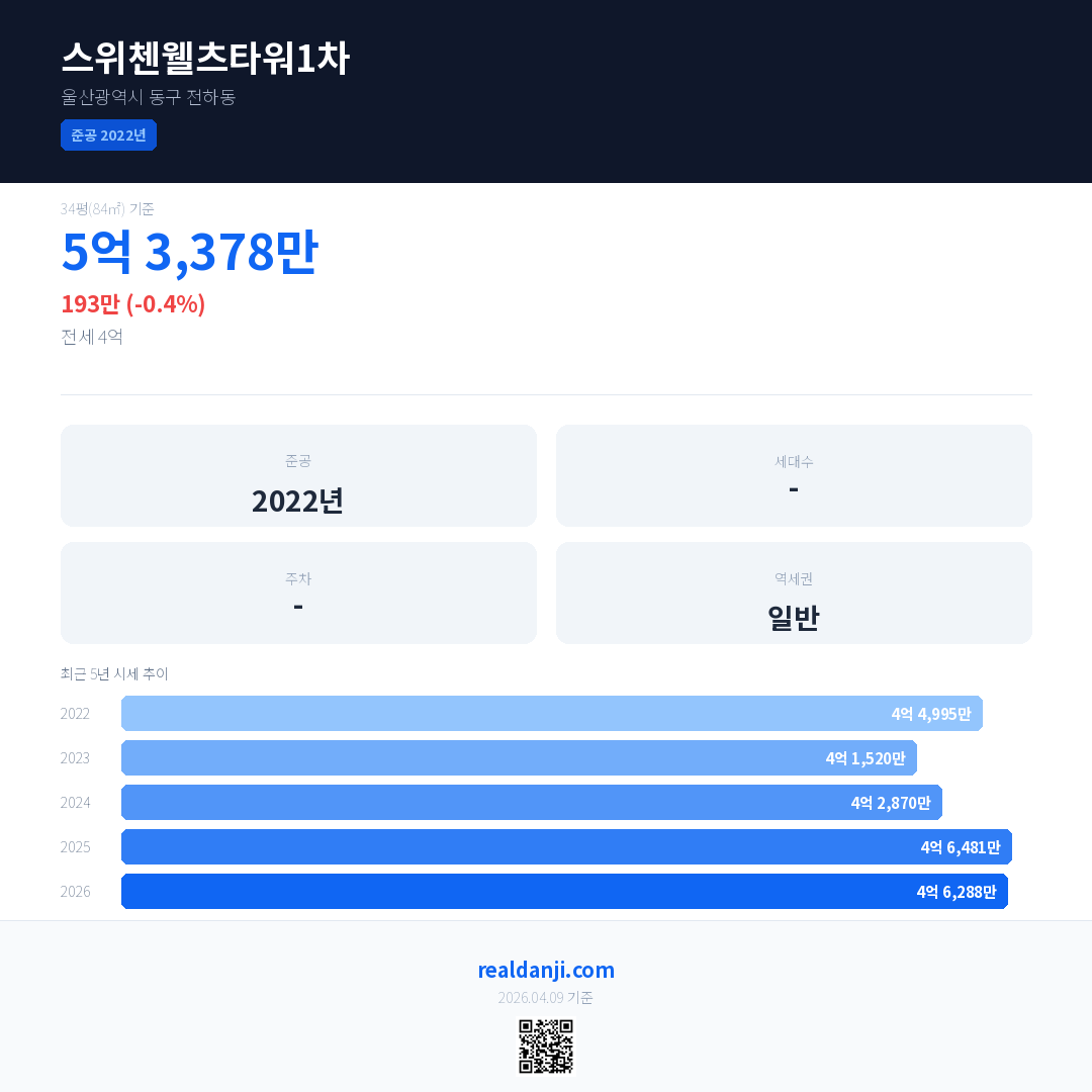 스위첸웰츠타워1차 국민평형 기준 2026년 평균 거래가는 4억 6,288만으로, 전년 대비 0.4% 하락 했습니다.