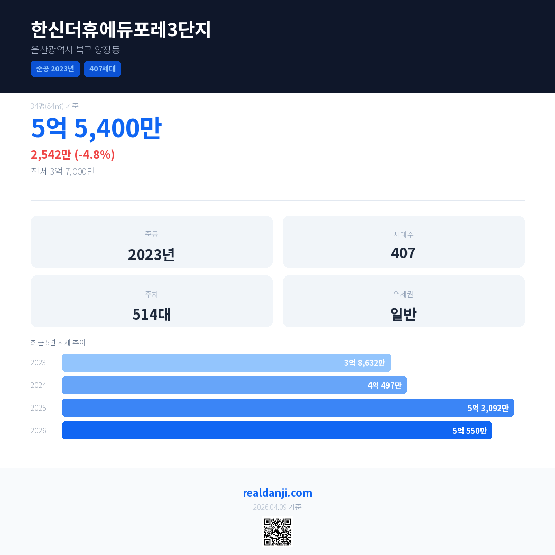 한신더휴에듀포레3단지은(는) 2023년에 준공되었으며, 현재 3년차입니다. 총 407세대 규모입니다.