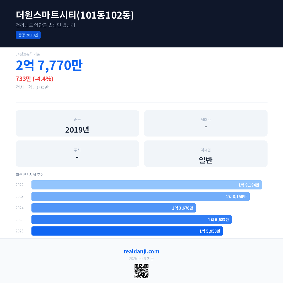 더원스마트시티(101동102동) 국민평형 기준 2026년 평균 거래가는 1억 5,950만으로, 전년 대비 4.4% 하락 했습니다.