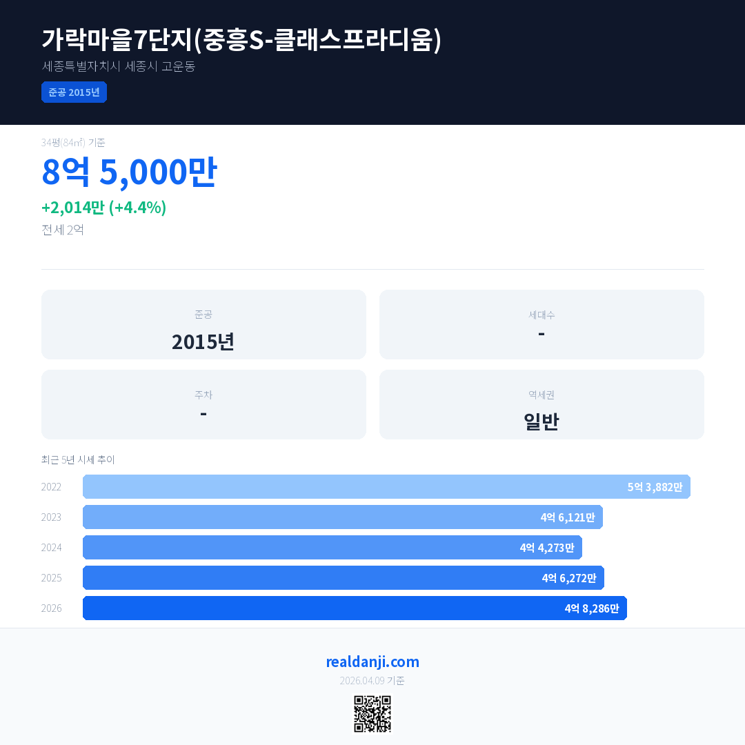 가락마을7단지(중흥S-클래스프라디움) 국민평형 기준 2026년 평균 거래가는 4억 8,286만으로, 전년 대비 4.4% 상승 했습니다.