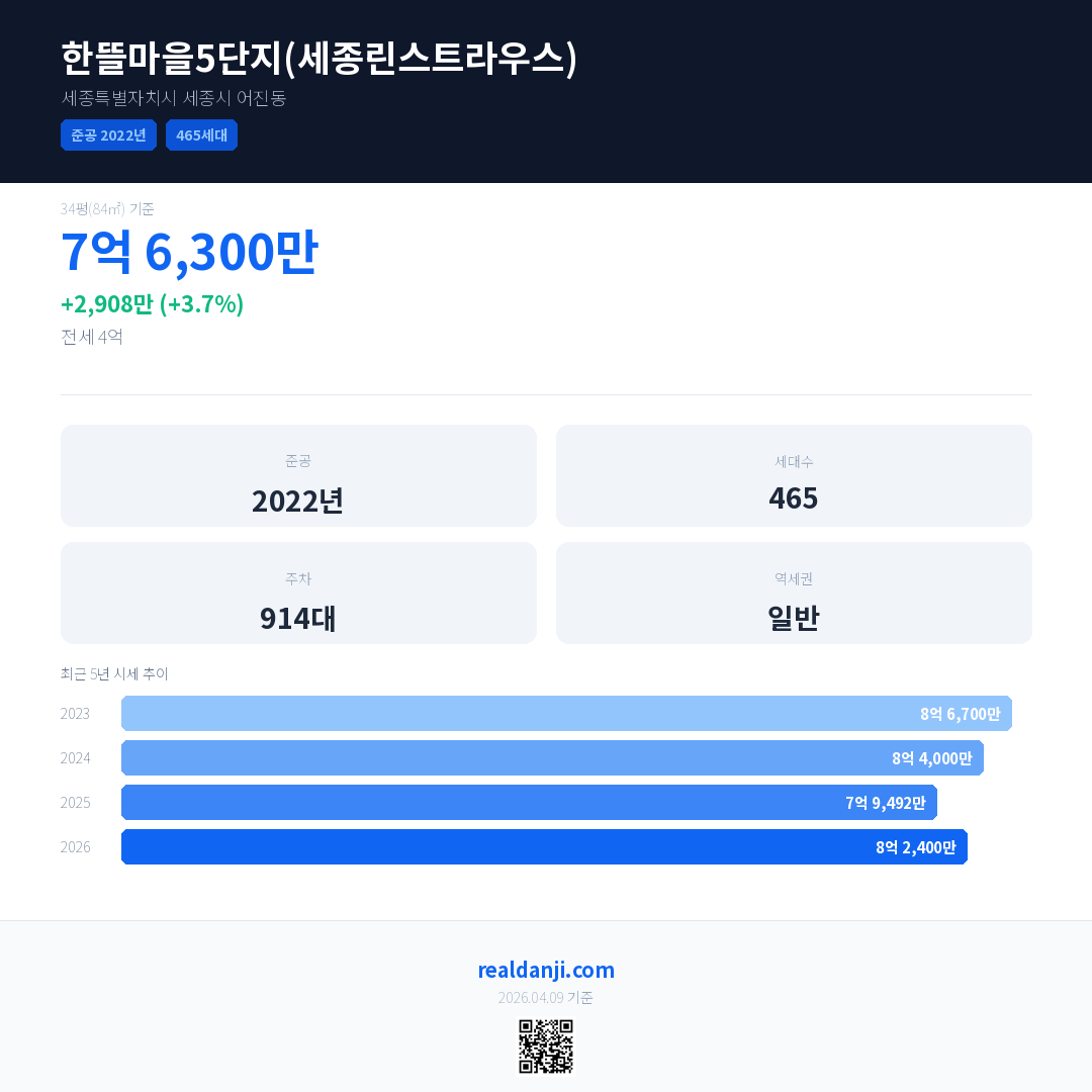 한뜰마을5단지(세종린스트라우스) 국민평형 기준 2026년 평균 거래가는 8억 2,400만으로, 전년 대비 3.7% 상승 했습니다.