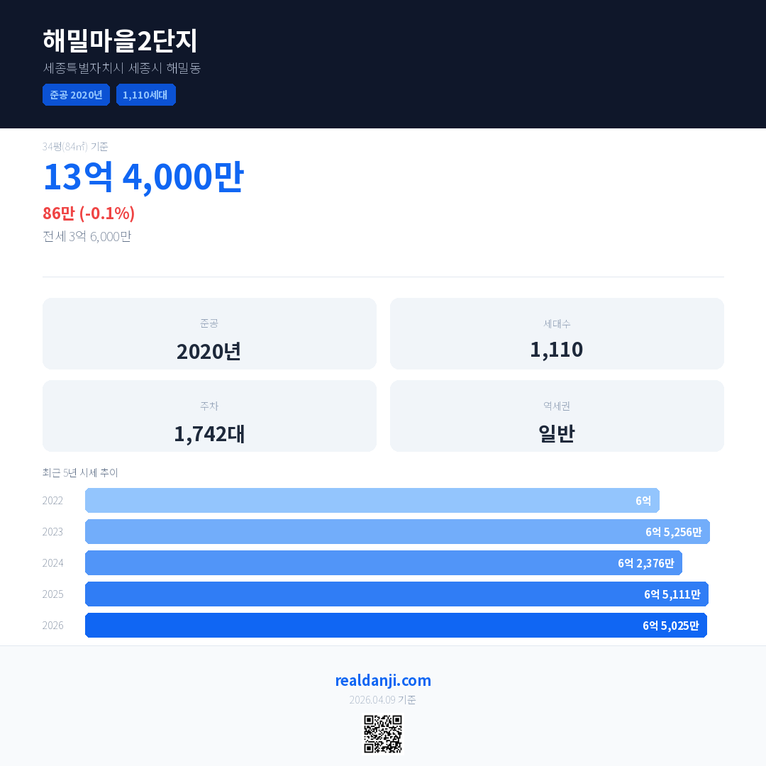 해밀마을2단지 국민평형 기준 2026년 평균 거래가는 6억 5,025만으로, 전년 대비 0.1% 하락 했습니다.