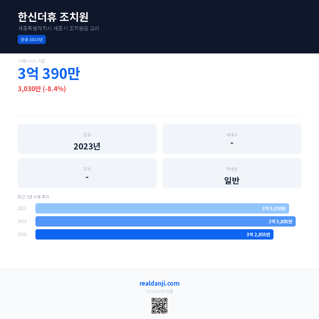 한신더휴 조치원 국민평형 기준 2026년 평균 거래가는 3억 2,855만으로, 전년 대비 8.4% 하락 했습니다.