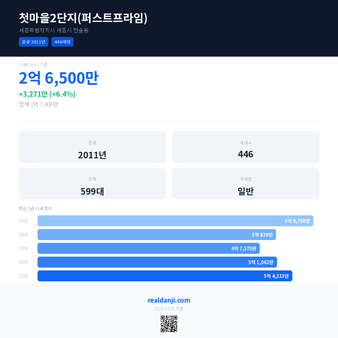 첫마을2단지(퍼스트프라임)은(는) 2011년에 준공되었으며, 현재 15년차입니다. 총 446세대 규모입니다.