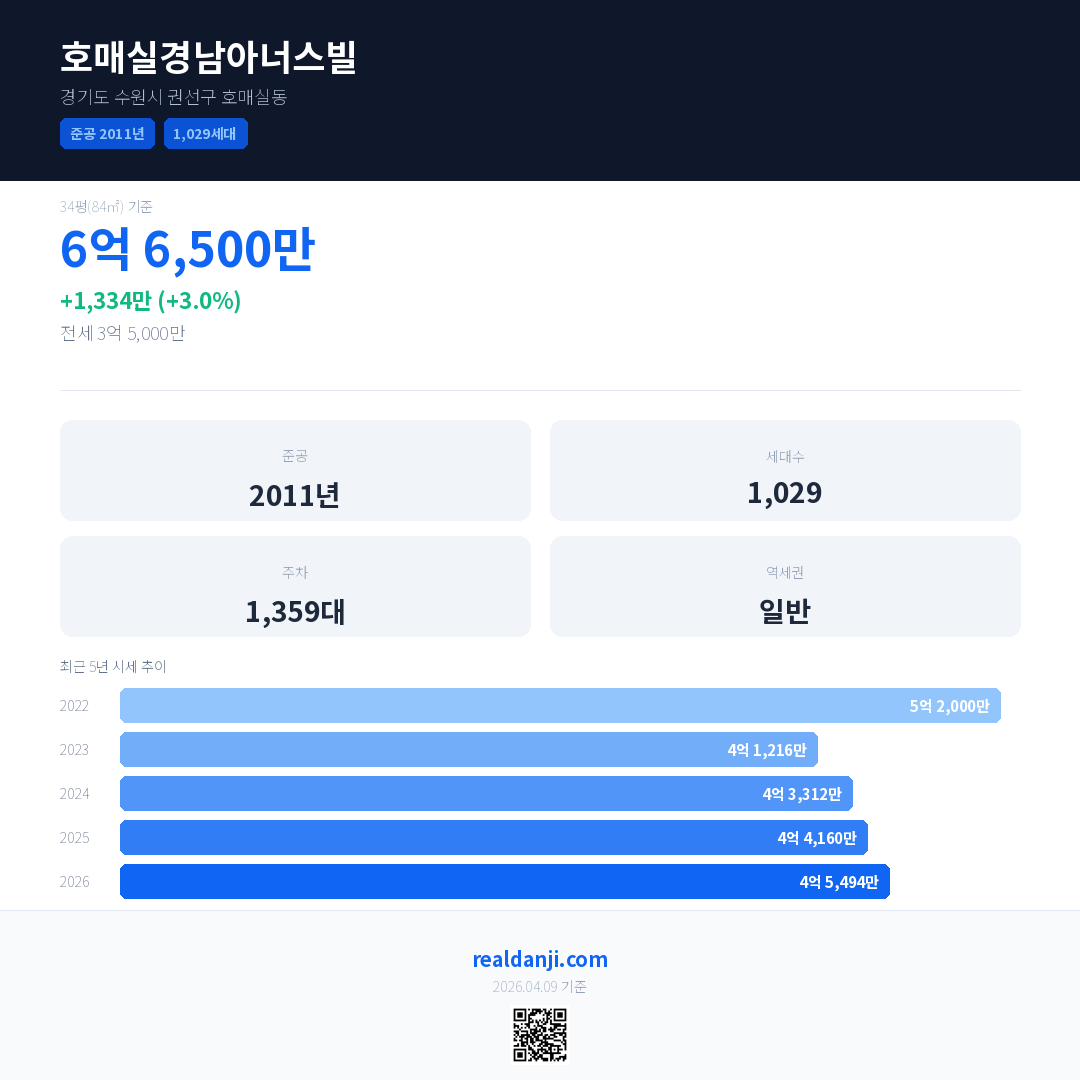 호매실경남아너스빌 국민평형 기준 2026년 평균 거래가는 4억 5,494만으로, 전년 대비 3.0% 상승 했습니다.
