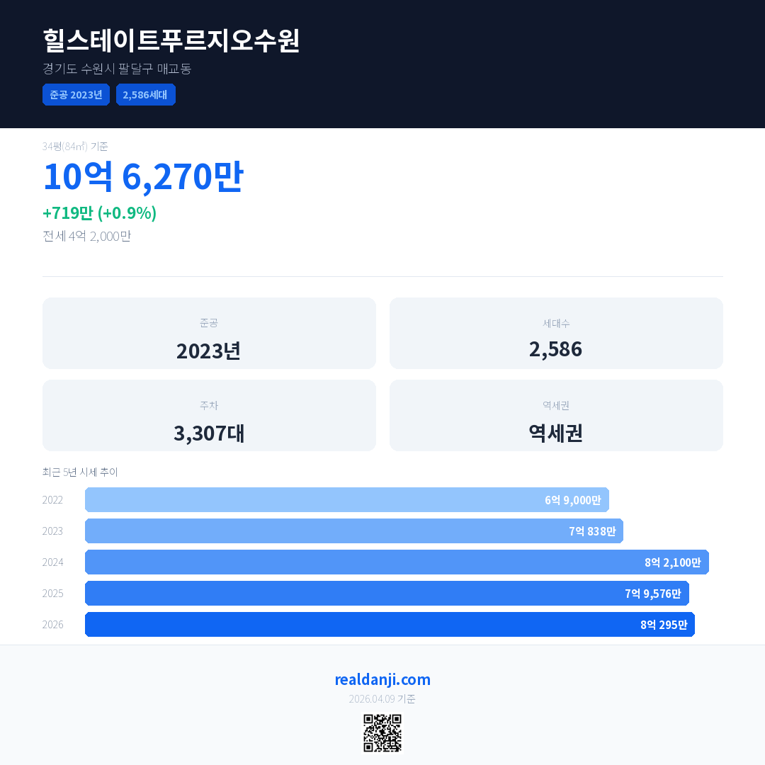 힐스테이트푸르지오수원 국민평형 기준 2026년 평균 거래가는 8억 295만으로, 전년 대비 0.9% 상승 했습니다.