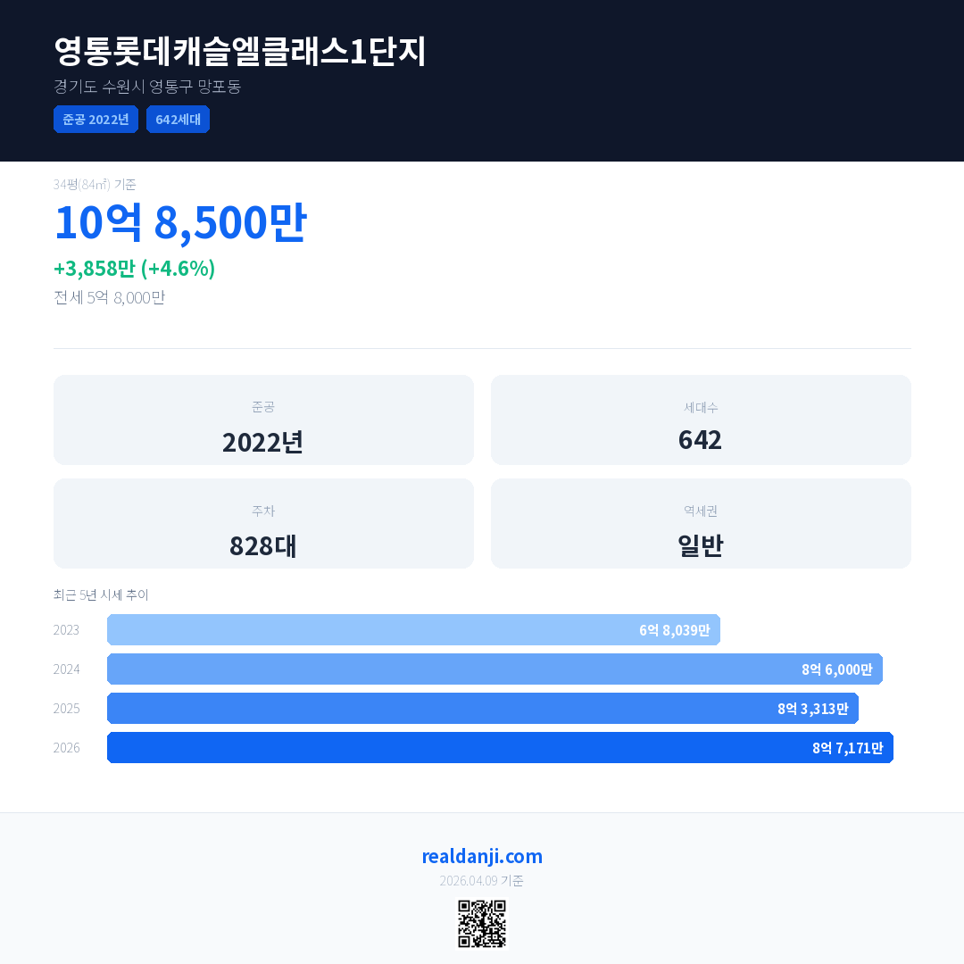 영통롯데캐슬엘클래스1단지 국민평형 기준 2026년 평균 거래가는 8억 7,171만으로, 전년 대비 4.6% 상승 했습니다.
