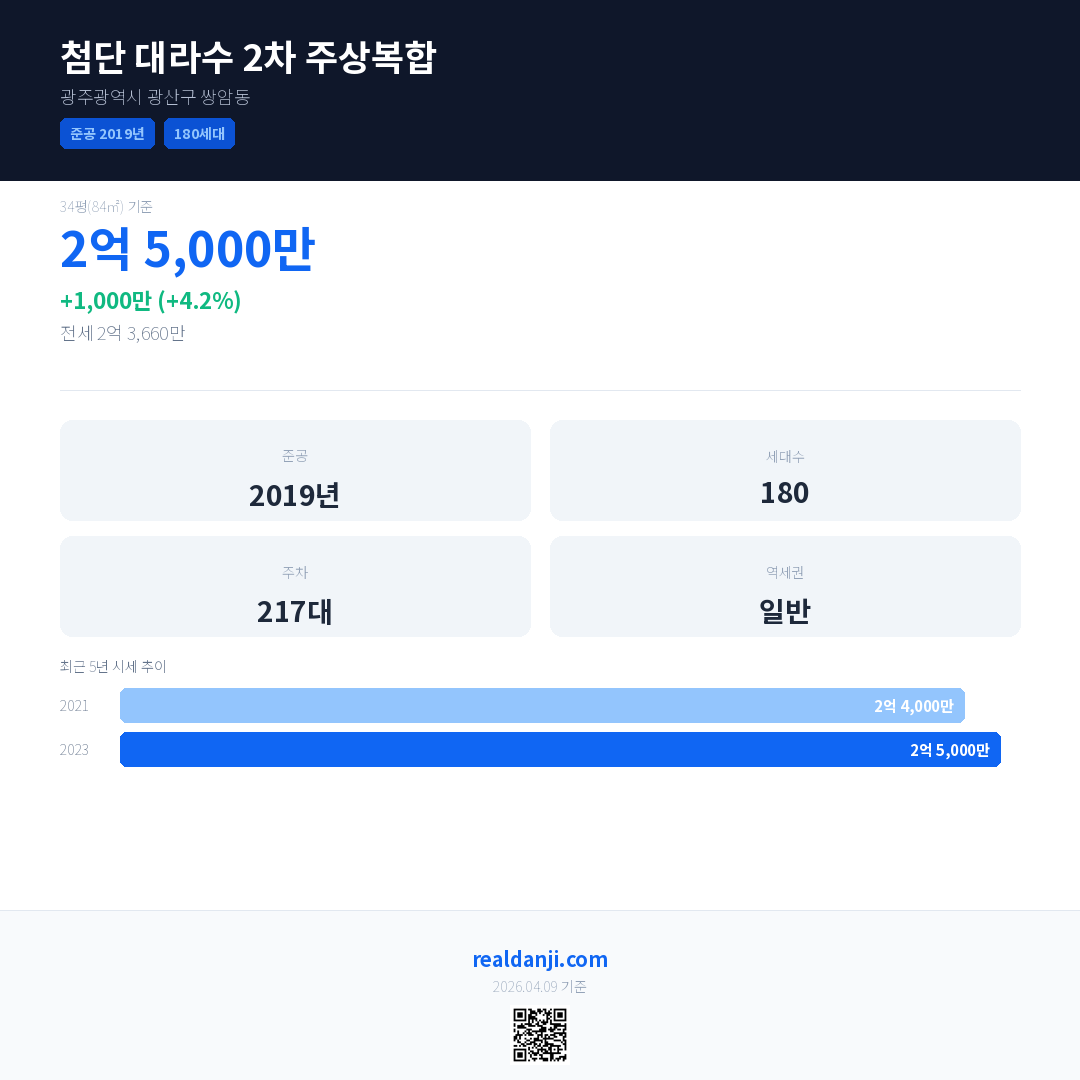 첨단 대라수 2차 주상복합 최근 거래가는 2억 5,000만입니다. (2023-09)