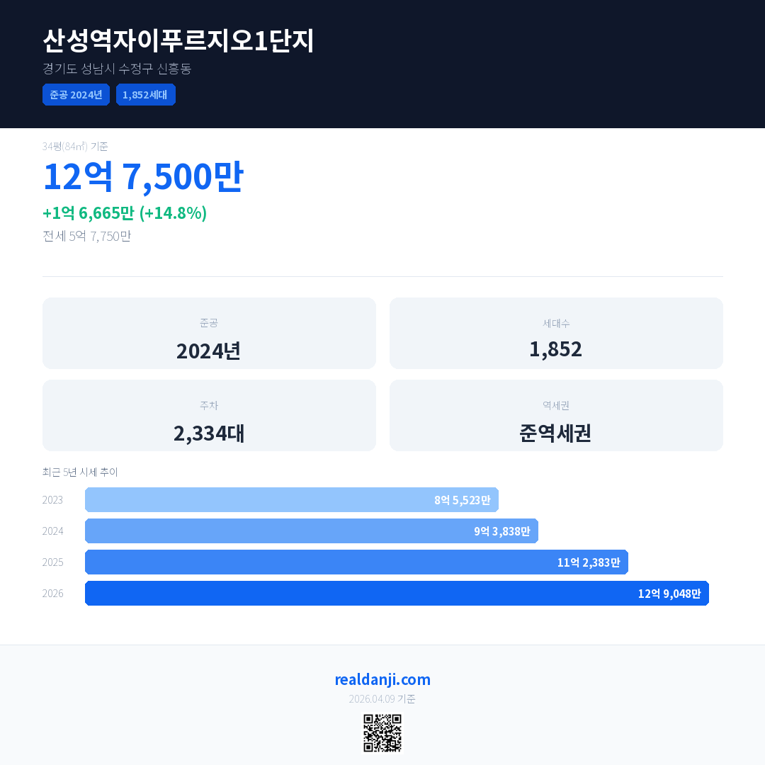 산성역자이푸르지오1단지 국민평형 기준 2026년 평균 거래가는 12억 9,048만으로, 전년 대비 14.8% 상승 했습니다.
