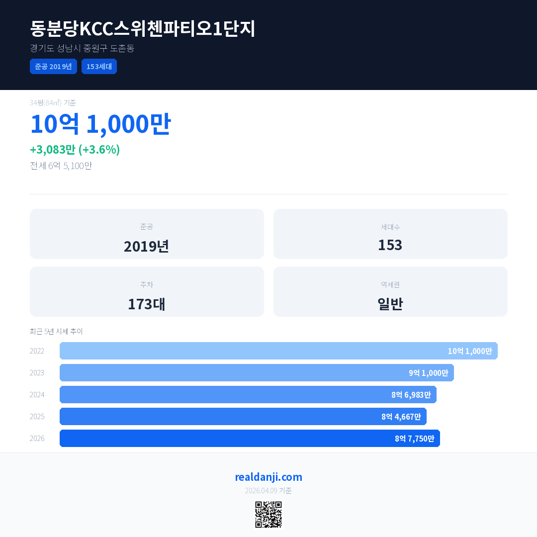동분당KCC스위첸파티오1단지 최근 거래가는 10억 1,000만입니다. (2026-02)