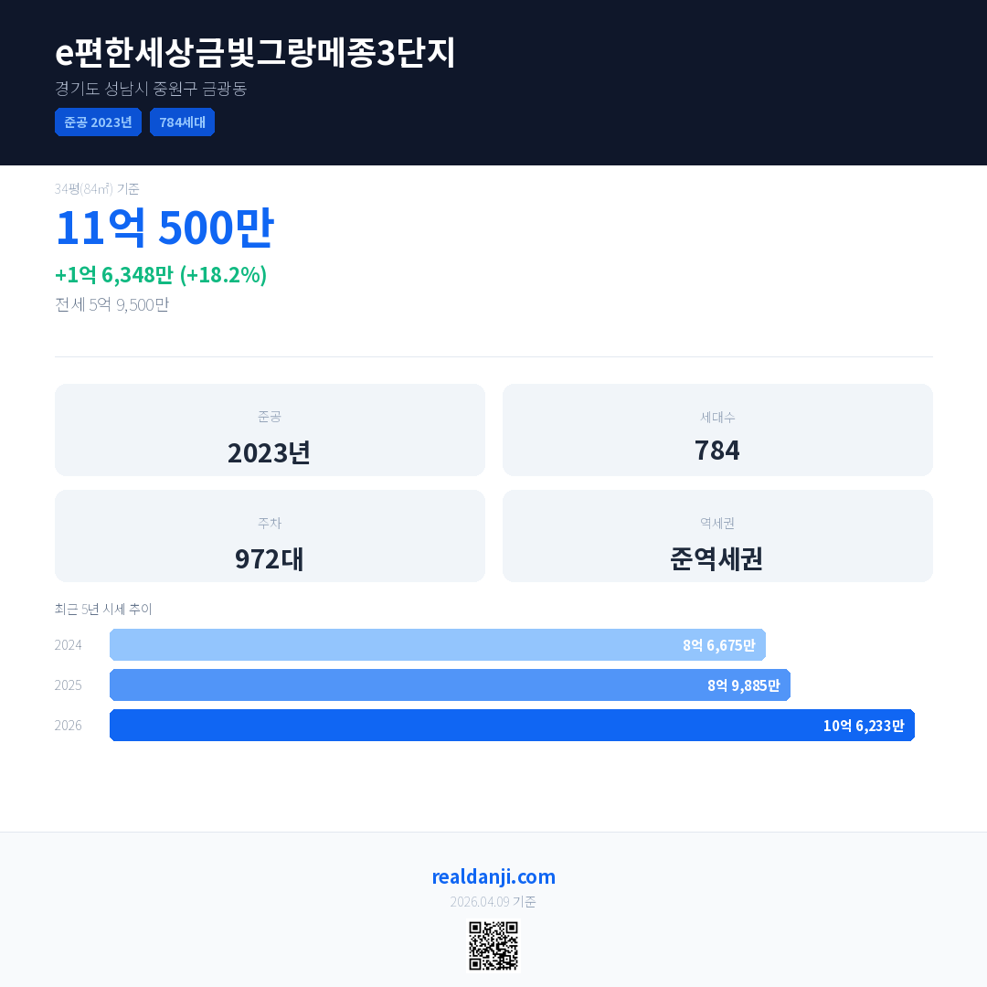 e편한세상금빛그랑메종3단지은(는) 2023년에 준공되었으며, 현재 3년차입니다. 총 784세대 규모입니다.