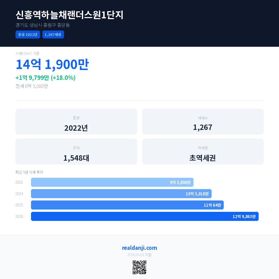 신흥역하늘채랜더스원1단지 국민평형 기준 2026년 평균 거래가는 12억 9,863만으로, 전년 대비 18.0% 상승 했습니다.