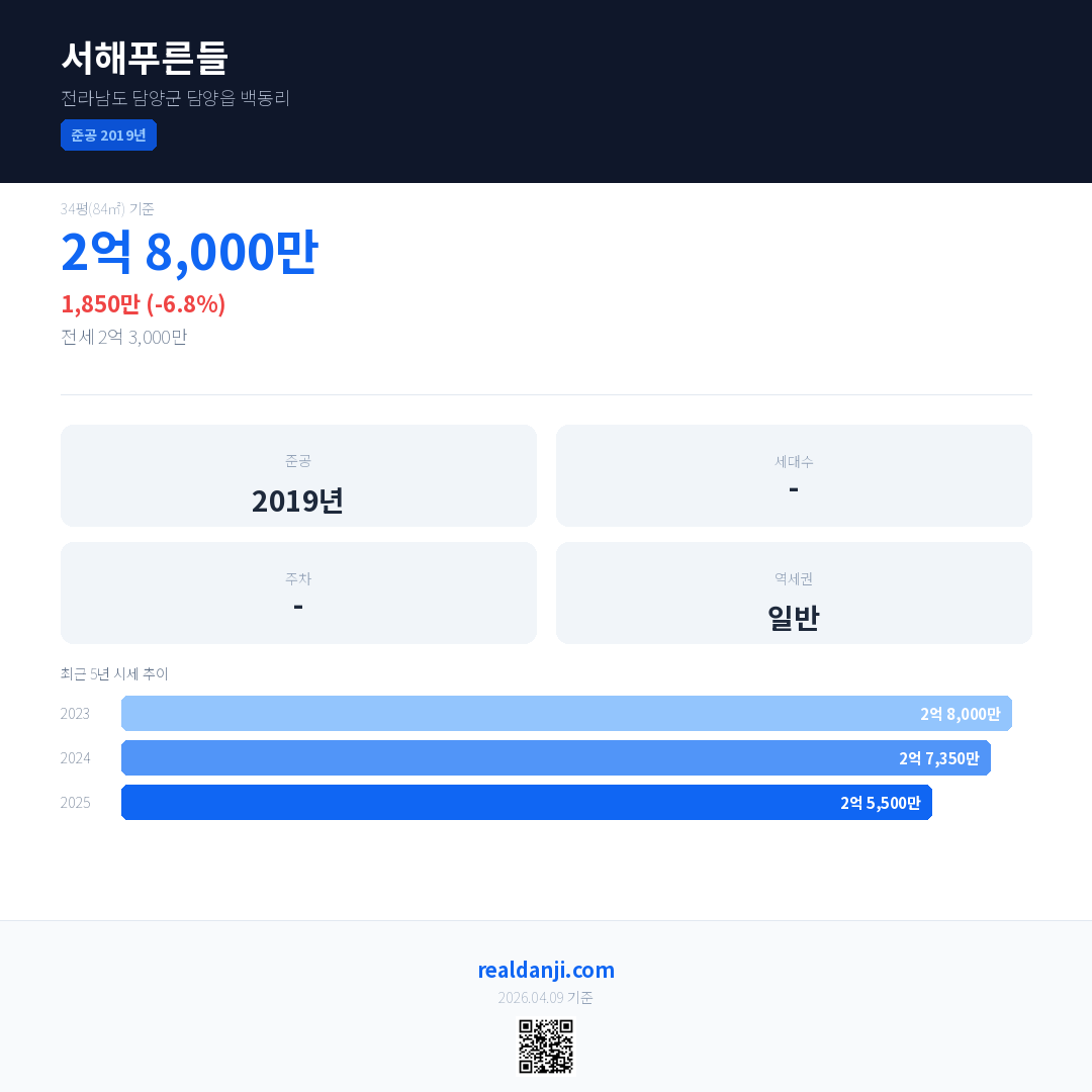 서해푸른들 국민평형 기준 2025년 평균 거래가는 2억 5,500만으로, 전년 대비 6.8% 하락 했습니다.