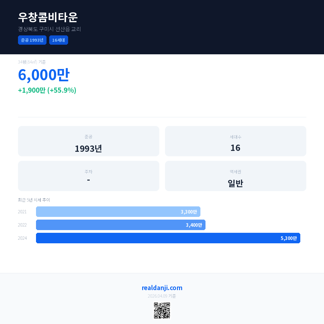 우창콤비타운 국민평형 기준 2024년 평균 거래가는 5,300만으로, 전년 대비 55.9% 상승 했습니다.