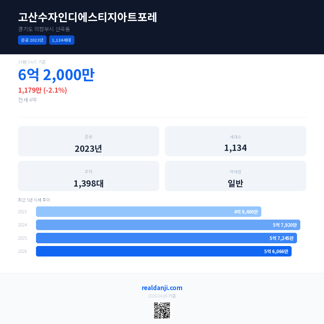 고산수자인디에스티지아트포레 최근 거래가는 6억 2,000만입니다. (2026-04)