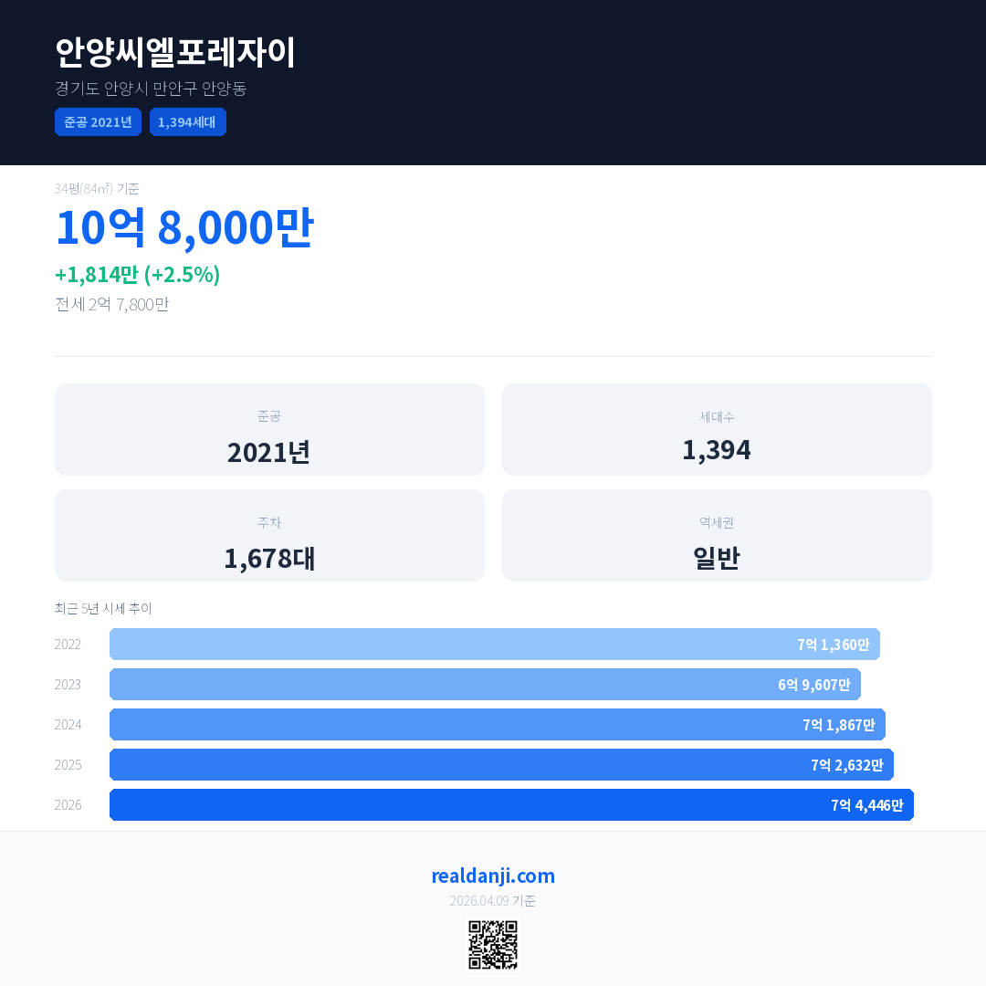 안양씨엘포레자이 국민평형 기준 2026년 평균 거래가는 7억 4,446만으로, 전년 대비 2.5% 상승 했습니다.