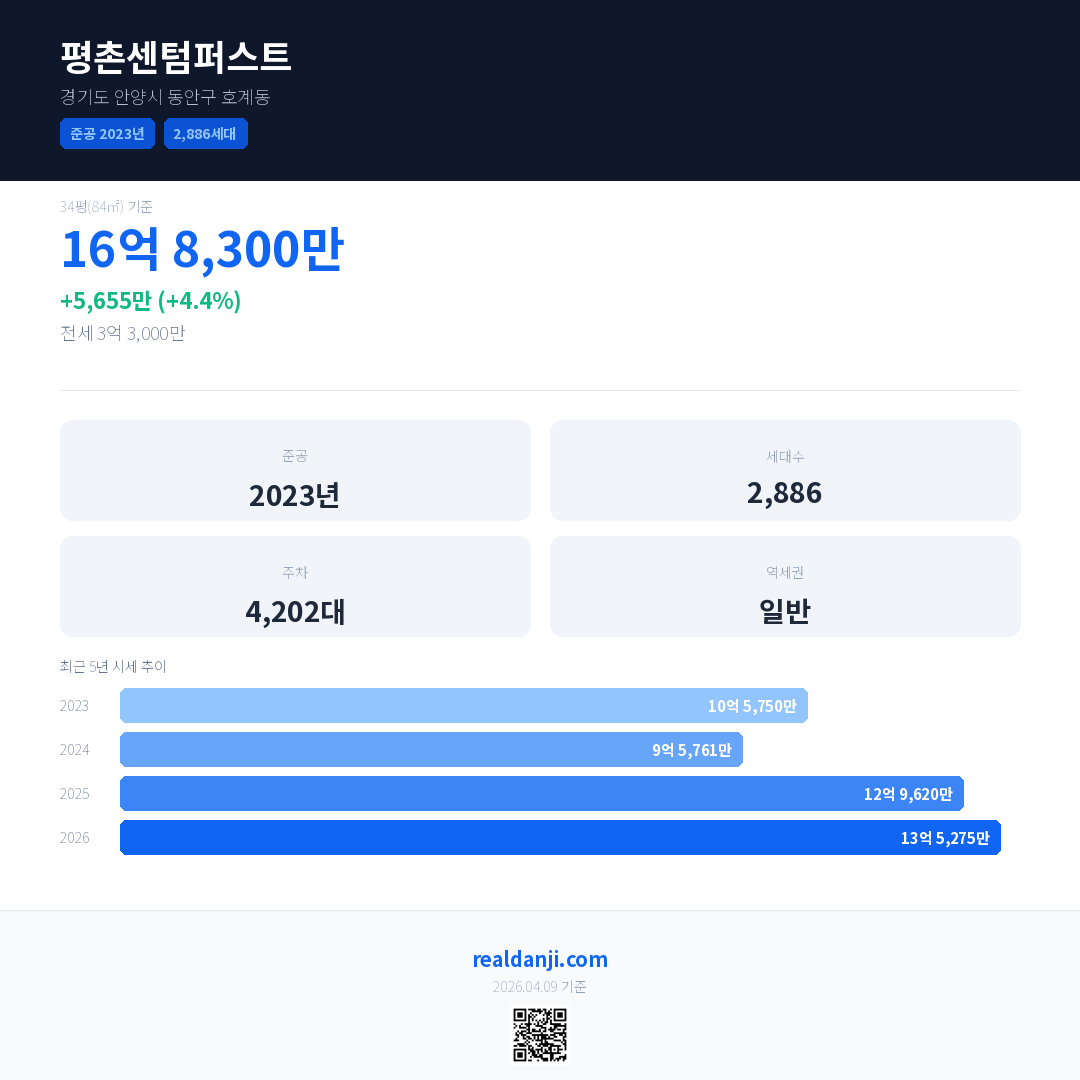 평촌센텀퍼스트 최근 거래가는 16억 8,300만입니다. (2026-04)