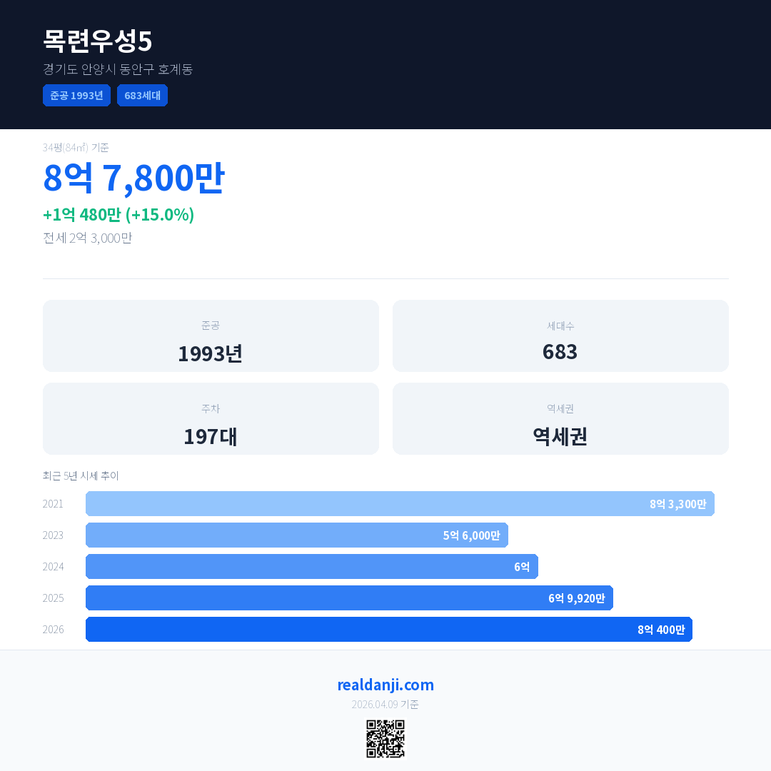 목련우성5 국민평형 기준 2026년 평균 거래가는 8억 400만으로, 전년 대비 15.0% 상승 했습니다.