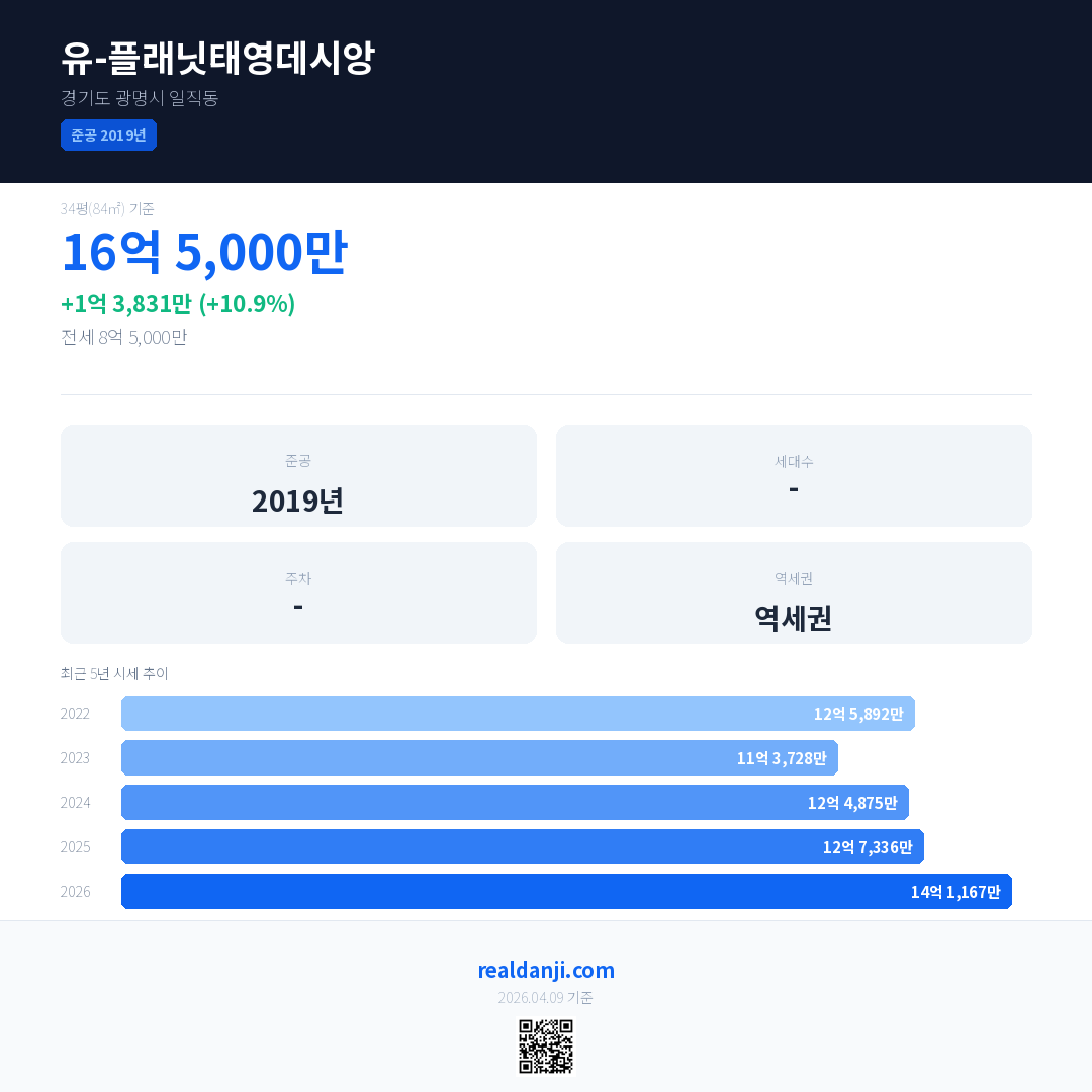 유-플래닛태영데시앙 국민평형 기준 2026년 평균 거래가는 14억 1,167만으로, 전년 대비 10.9% 상승 했습니다.