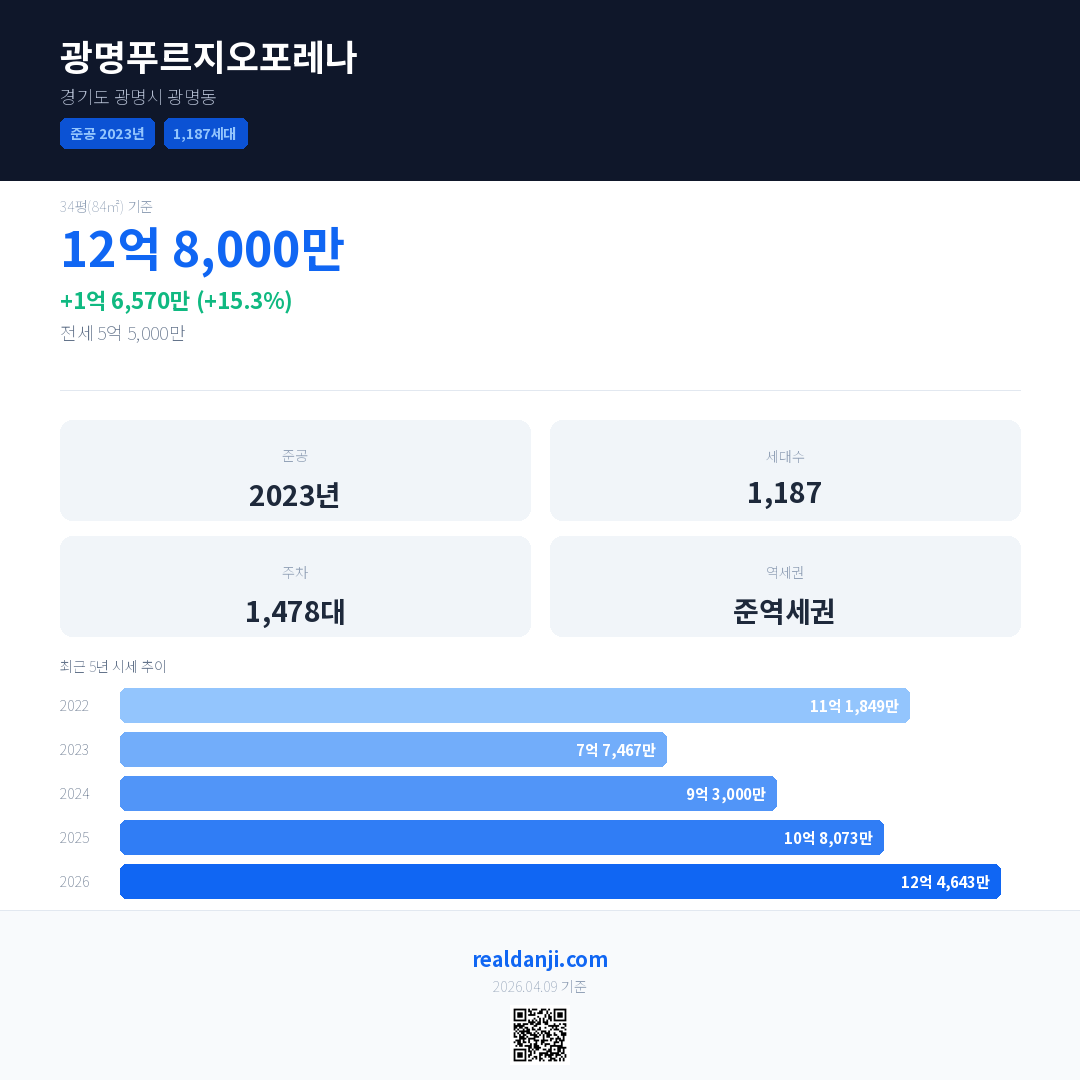 광명푸르지오포레나 국민평형 기준 2026년 평균 거래가는 12억 4,643만으로, 전년 대비 15.3% 상승 했습니다.