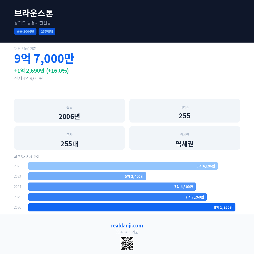 브라운스톤 최근 거래가는 9억 7,000만입니다. (2026-03)