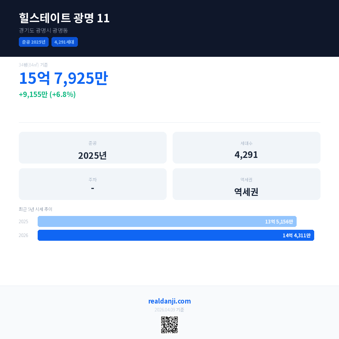 힐스테이트 광명 11 최근 거래가는 15억 7,925만입니다. (2026-02)