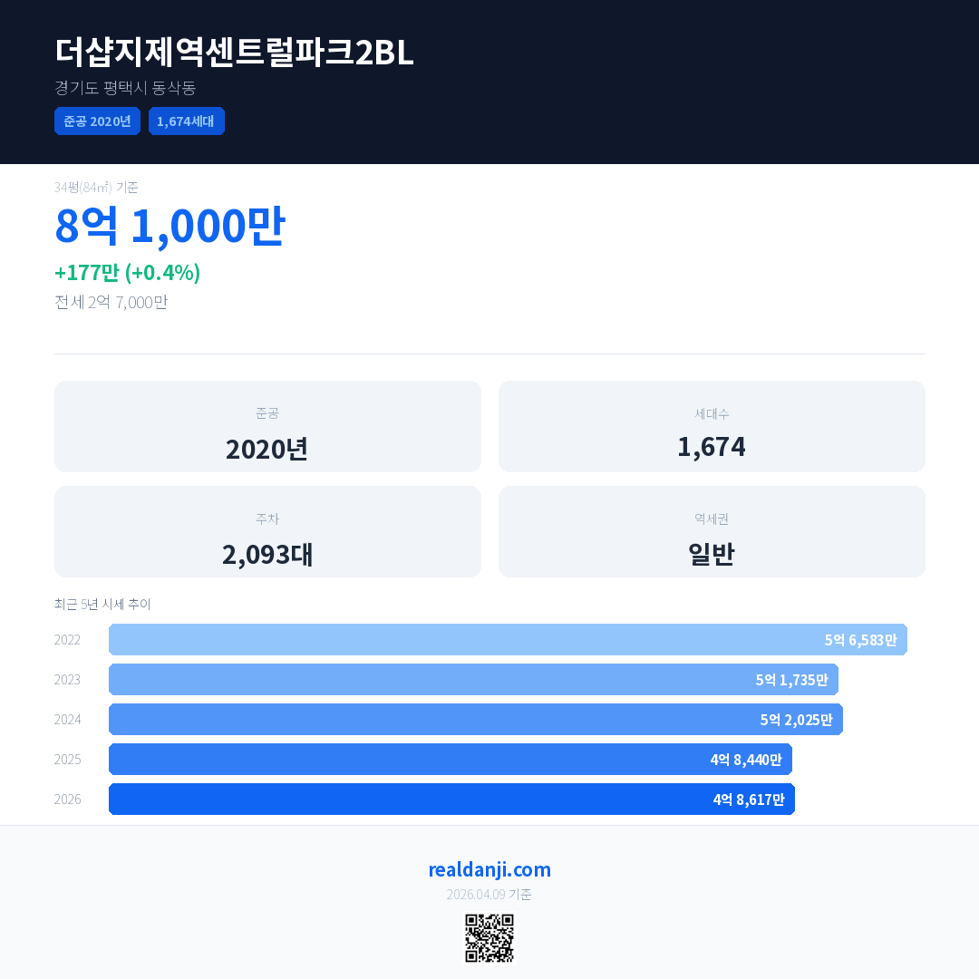 더샵지제역센트럴파크2BL 국민평형 기준 2026년 평균 거래가는 4억 8,617만으로, 전년 대비 0.4% 상승 했습니다.