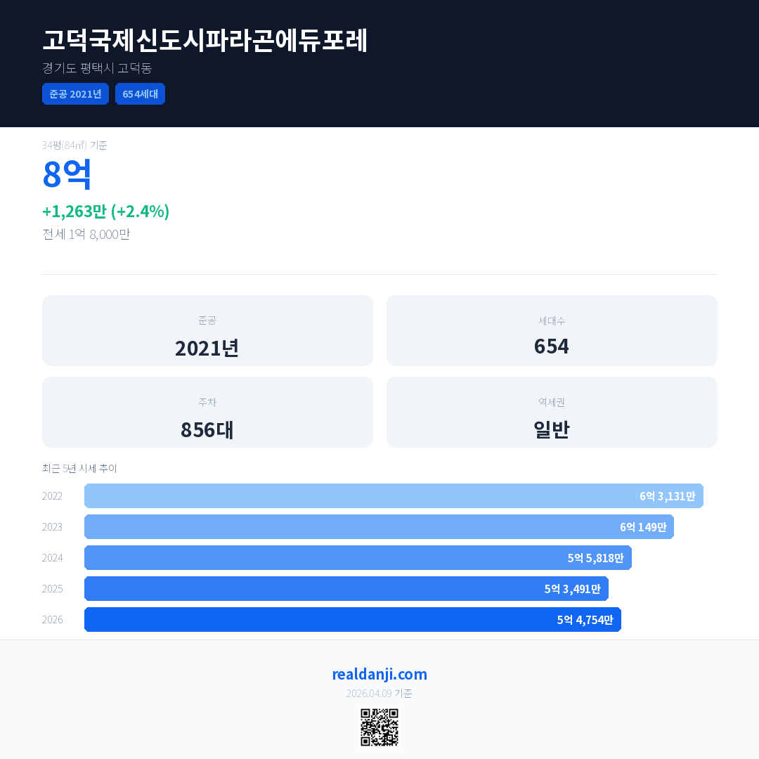 고덕국제신도시파라곤에듀포레 최근 거래가는 8억입니다. (2026-03)