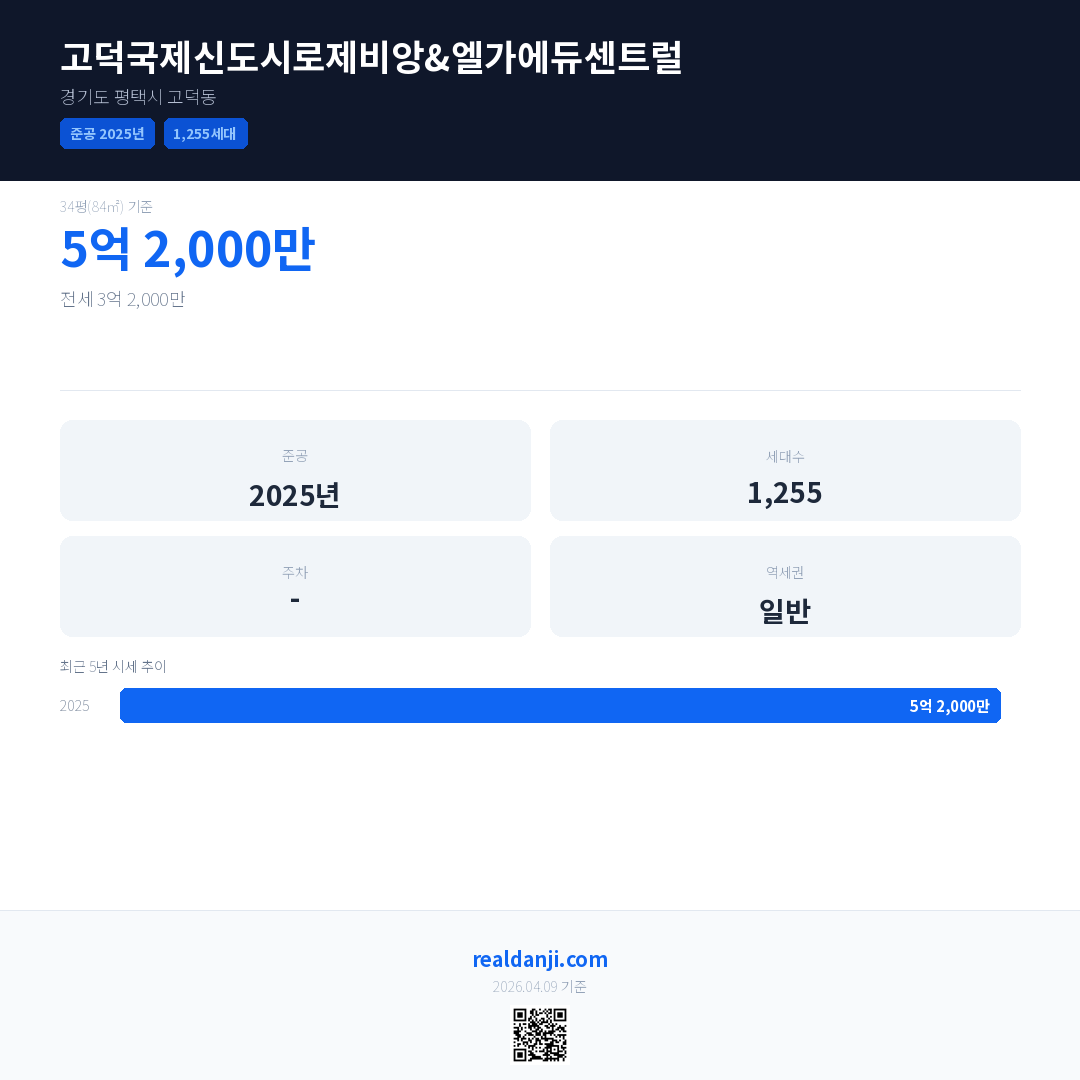 고덕국제신도시로제비앙&엘가에듀센트럴은(는) 2025년에 준공되었으며, 현재 1년차입니다. 총 1,255세대 규모입니다.