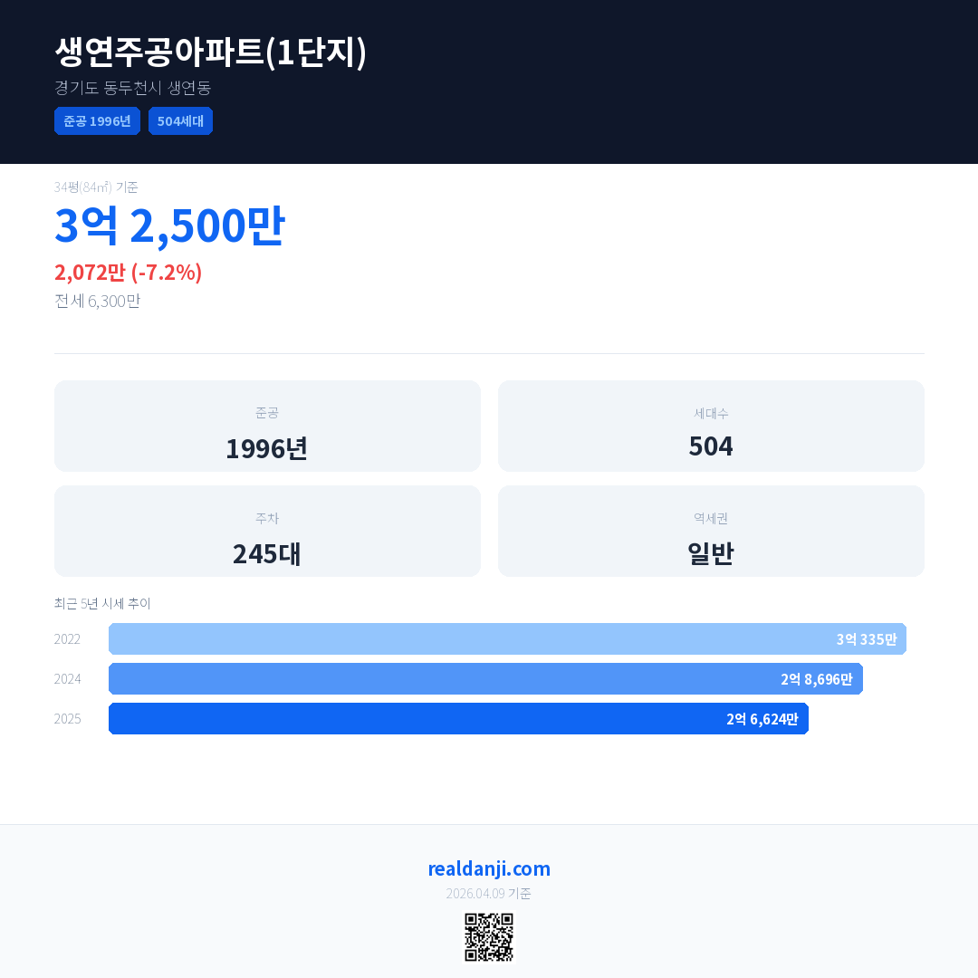 생연주공아파트(1단지) 국민평형 기준 2025년 평균 거래가는 2억 6,624만으로, 전년 대비 7.2% 하락 했습니다.