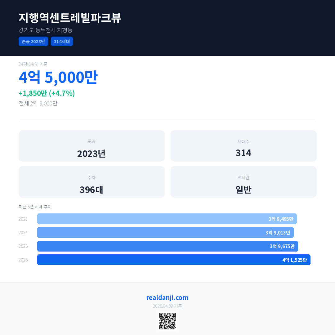 지행역센트레빌파크뷰 국민평형 기준 2026년 평균 거래가는 4억 1,525만으로, 전년 대비 4.7% 상승 했습니다.
