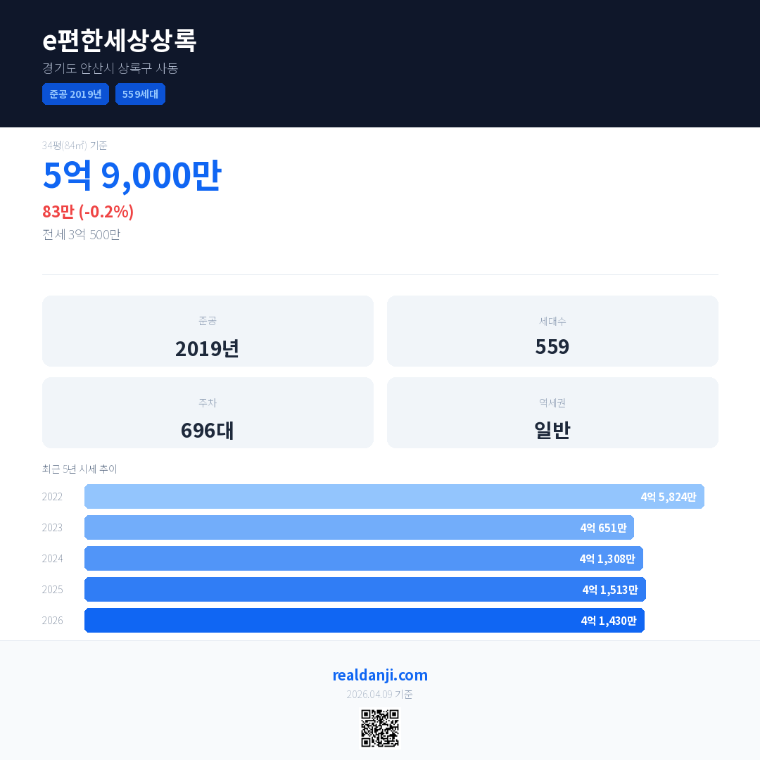 e편한세상상록은(는) 2019년에 준공되었으며, 현재 7년차입니다. 총 559세대 규모입니다.