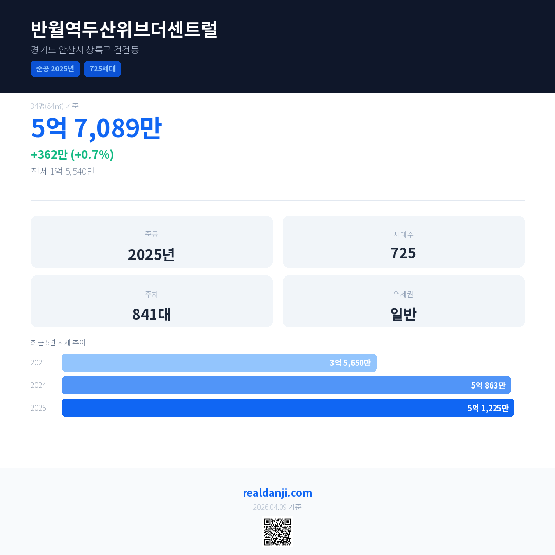 반월역두산위브더센트럴 국민평형 기준 2025년 평균 거래가는 5억 1,225만으로, 전년 대비 0.7% 상승 했습니다.