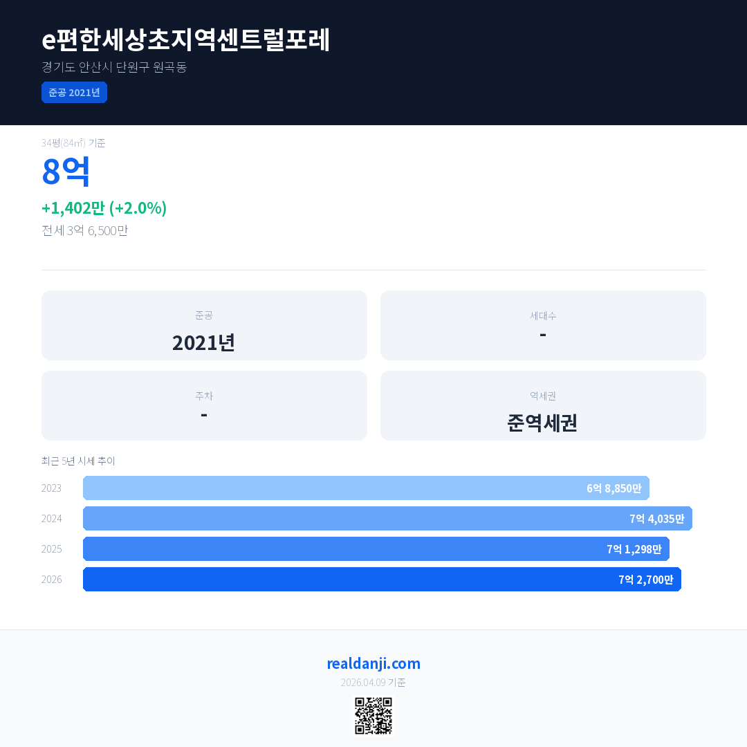 e편한세상초지역센트럴포레 최근 거래가는 8억입니다. (2026-04)