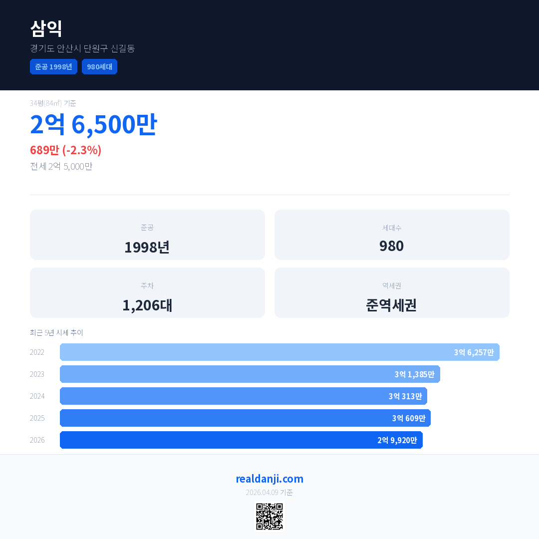 삼익 최근 거래가는 2억 6,500만입니다. (2026-04)