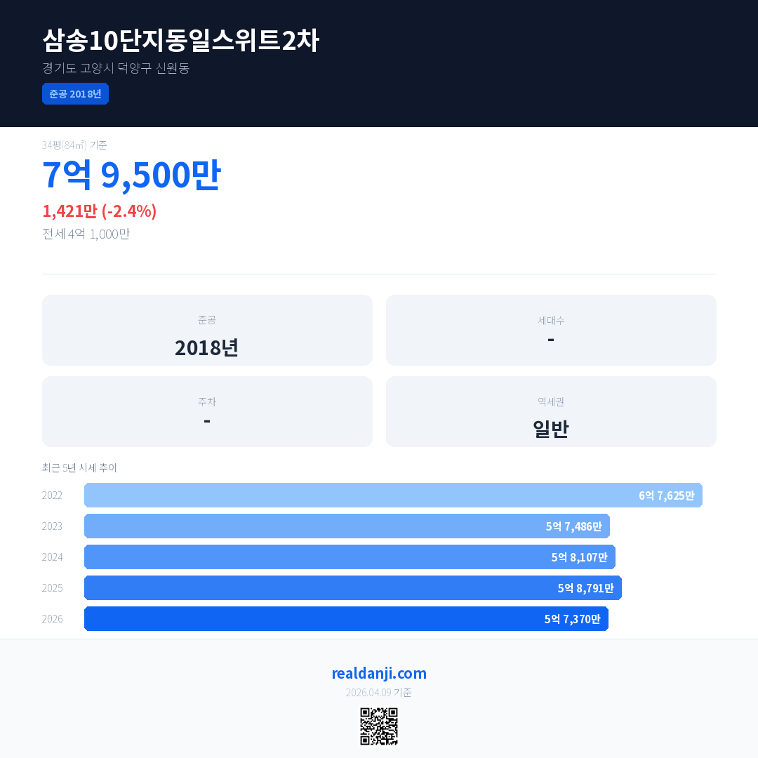 삼송10단지동일스위트2차은(는) 2018년에 준공되었으며, 현재 8년차입니다.