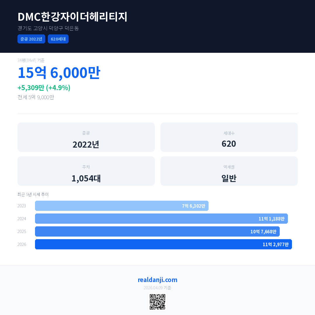 DMC한강자이더헤리티지 국민평형 기준 2026년 평균 거래가는 11억 2,977만으로, 전년 대비 4.9% 상승 했습니다.