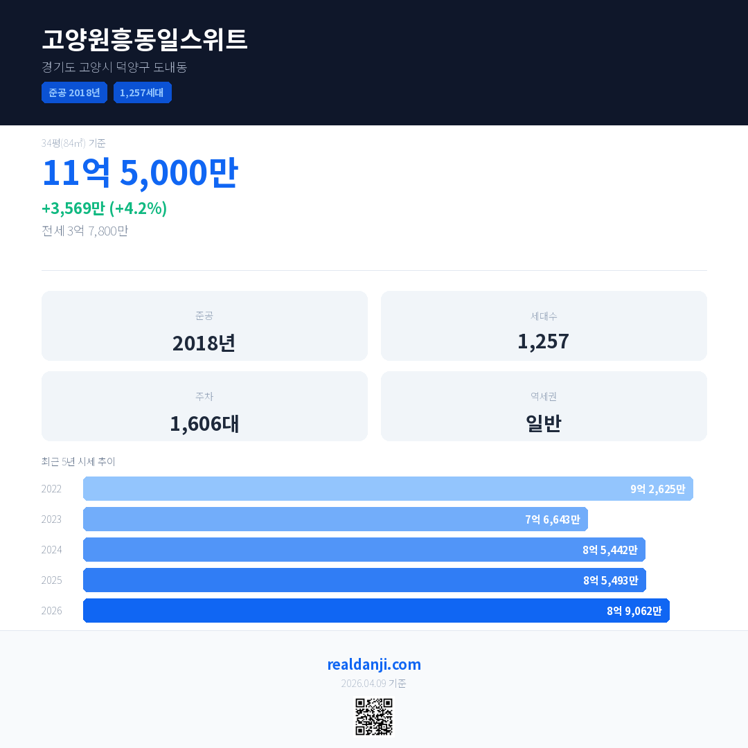 고양원흥동일스위트 국민평형 기준 2026년 평균 거래가는 8억 9,062만으로, 전년 대비 4.2% 상승 했습니다.