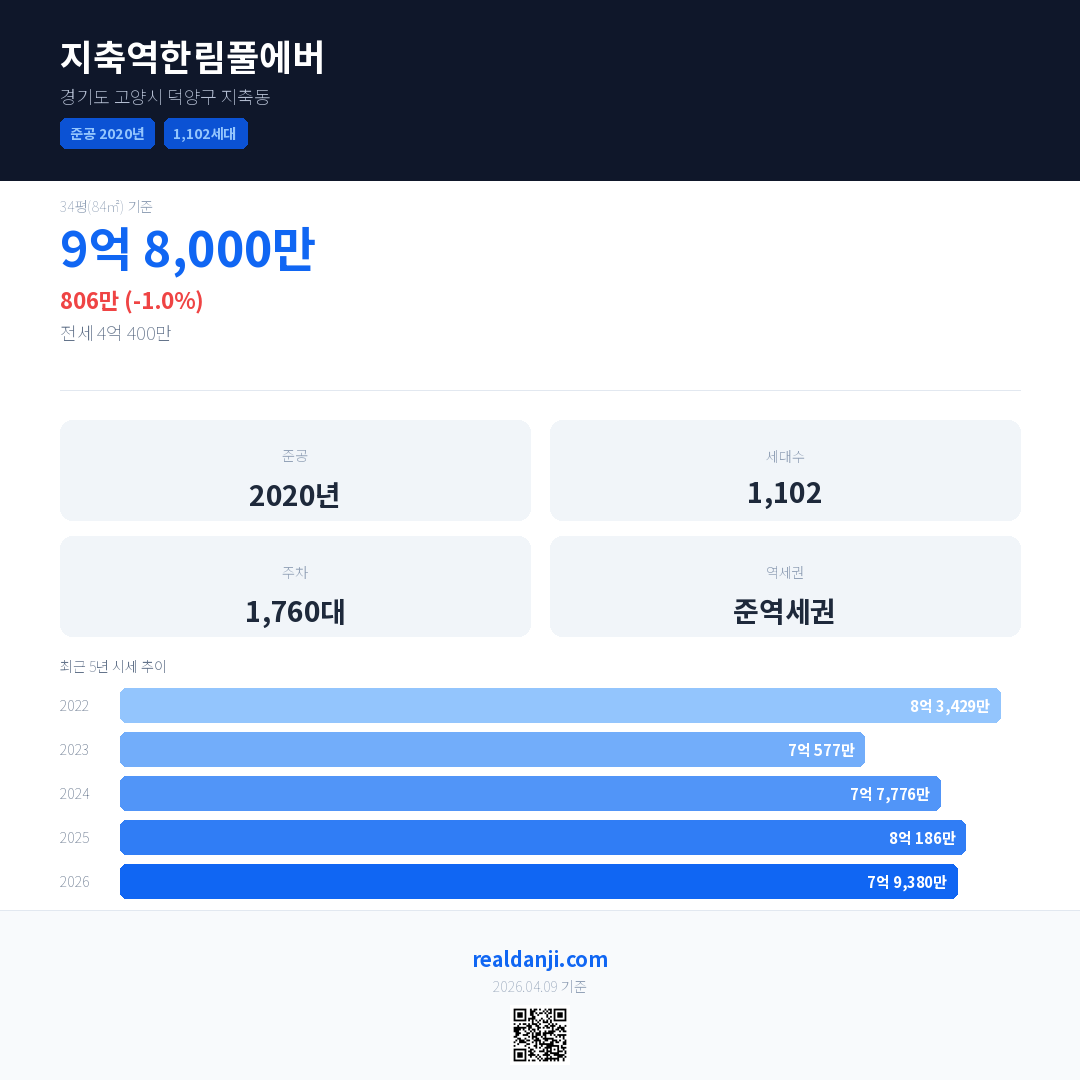 지축역한림풀에버 국민평형 기준 2026년 평균 거래가는 7억 9,380만으로, 전년 대비 1.0% 하락 했습니다.